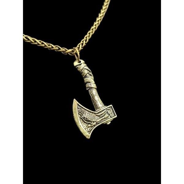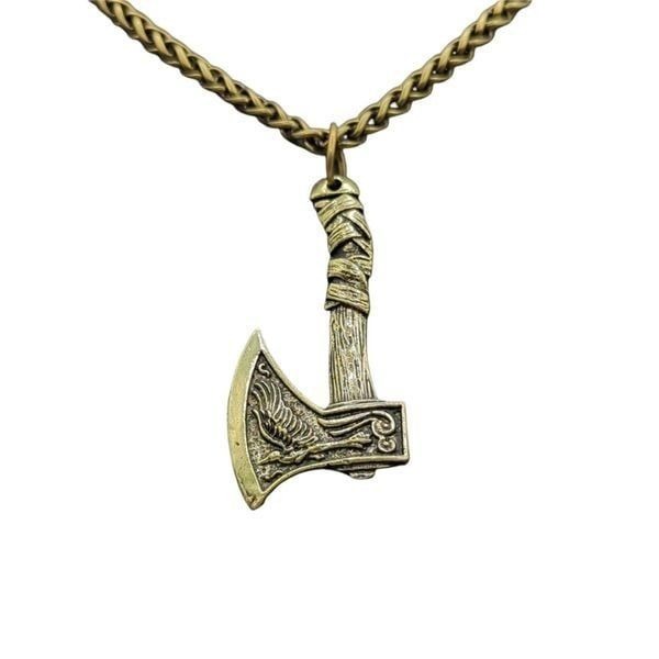 * Antique Gold Tone Viking Raven Wolf Axe Pendant