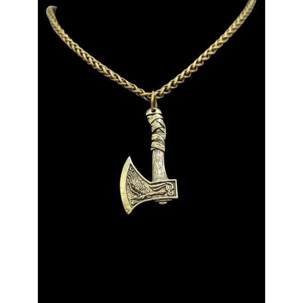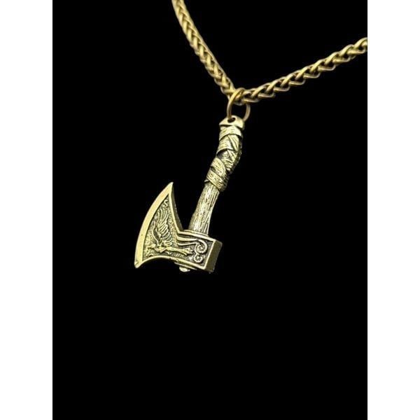New Antique Gold Tone Men's Viking Raven Wolf Axe Pendant over Brass Dipped In Silver To Include a Free White Gold Finish 24inch x 4mm Wheat Chain For Men or Woman.