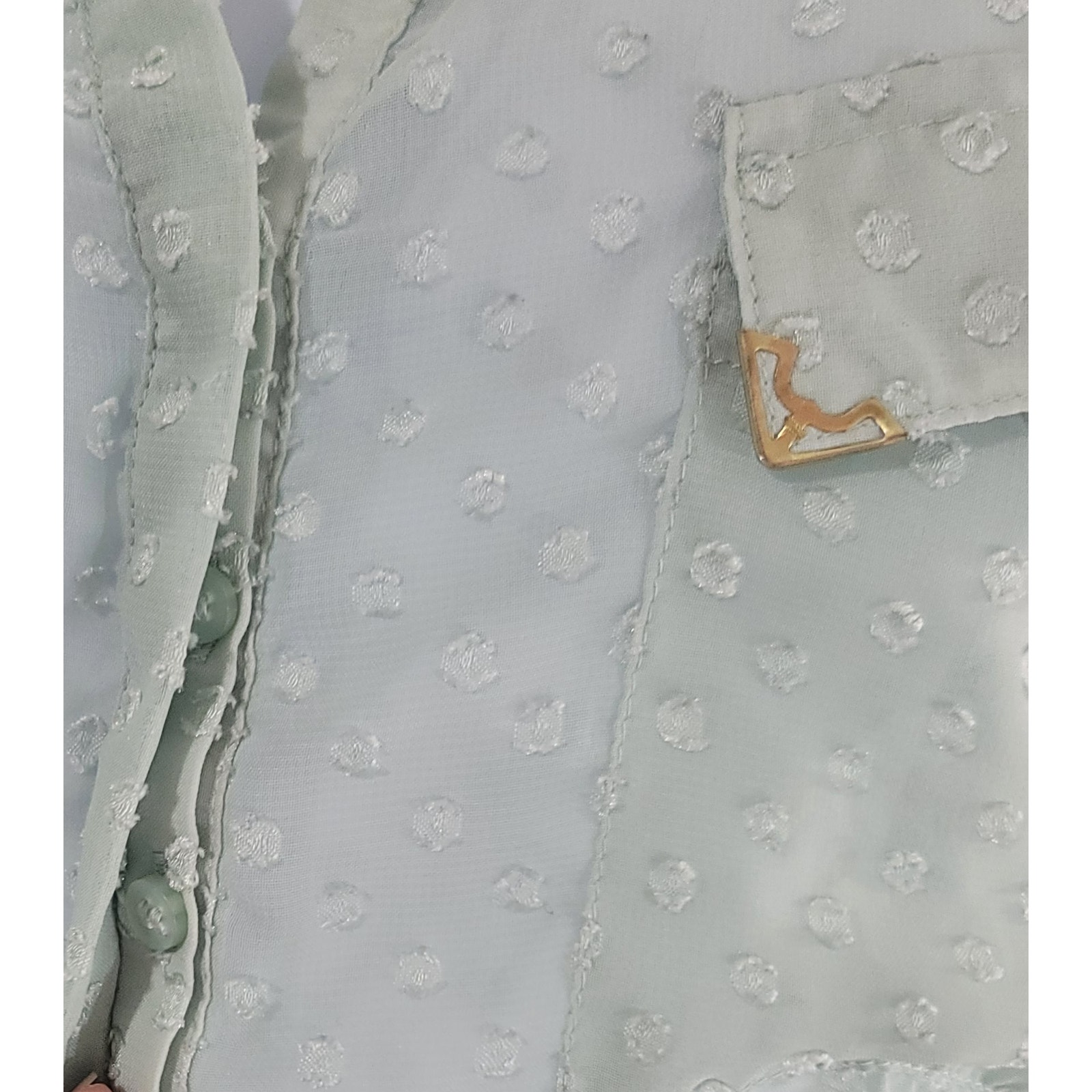 green, sheer, lightweight, 3/4 sleeves, v-neck, hidden button closure, raised sheer dots on blouse (see picture)