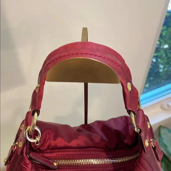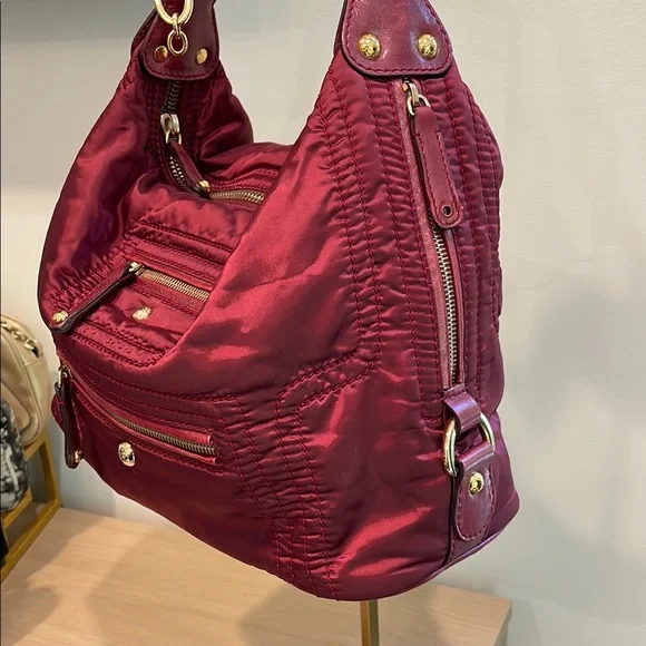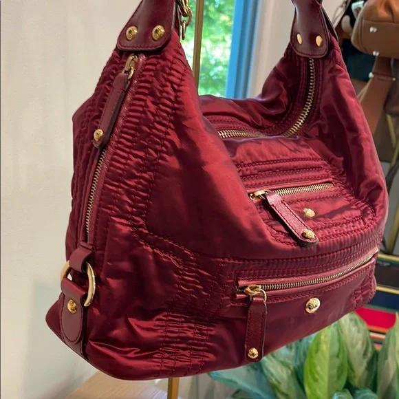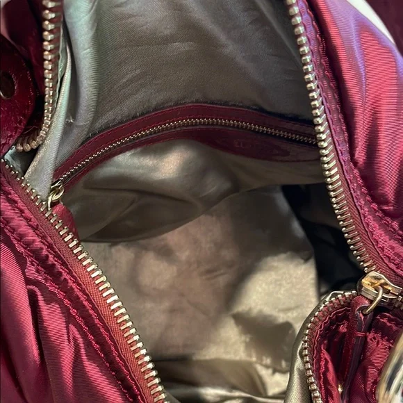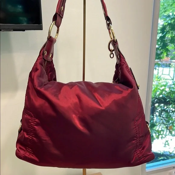This elegant & authentic Tod’s burgundy shoulder bag isa gorgeous bag.Material: Made of nylon fabric.Pockets: Features two front zippered pockets and a main top zippered compartment.Hardware: Includes gold-tone zippers and accents.Shape: Designed in a crescent, slouchy hobo style.Brand: Manufactured by Tod's, an Italian luxury brand.Style: Considered a stylish and practical accessory, suitable for everyday use.Includes Tod’s dust bag. In great condition. Doesn’t include a crossbody strap. Some small hardware pieces missing on pulls.