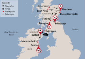 Hin- und Rückflug mit renommierter Fluggesellschaft (ggf. mit Zwischenstopp) nach Edinburgh und zurück von Dublin in der Economy Class. Rundreise im komfortablen Reisebus mit deutschsprachiger Reiseleitung. Umfassendes Ausflugspaket. Übernachten in RRR bis RRR Hotels.